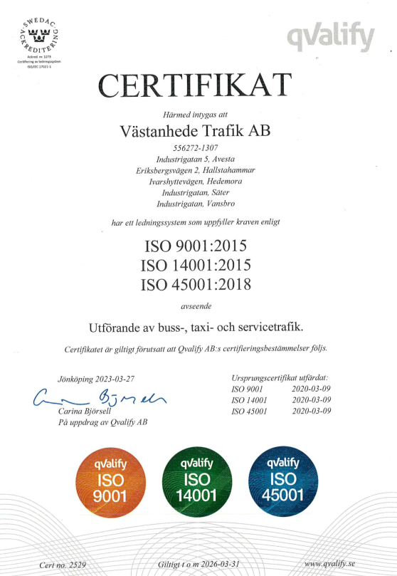 Vi har valt att ISO certifiera bolaget Västanhede Trafik för att visa, både internt och externt, att företaget är dedikerat till att systematiskt förbättra sin kvalitet och överträffa sina kunders förväntningar.